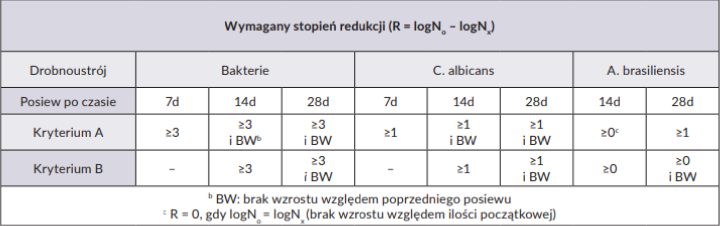 Zastosowany układ konserwujący uznaje się za skuteczny, jeżeli po określonym czasie kontaktu następuje wymagana normą redukcja liczby drobnoustrojów wprowadzonych do produktu: