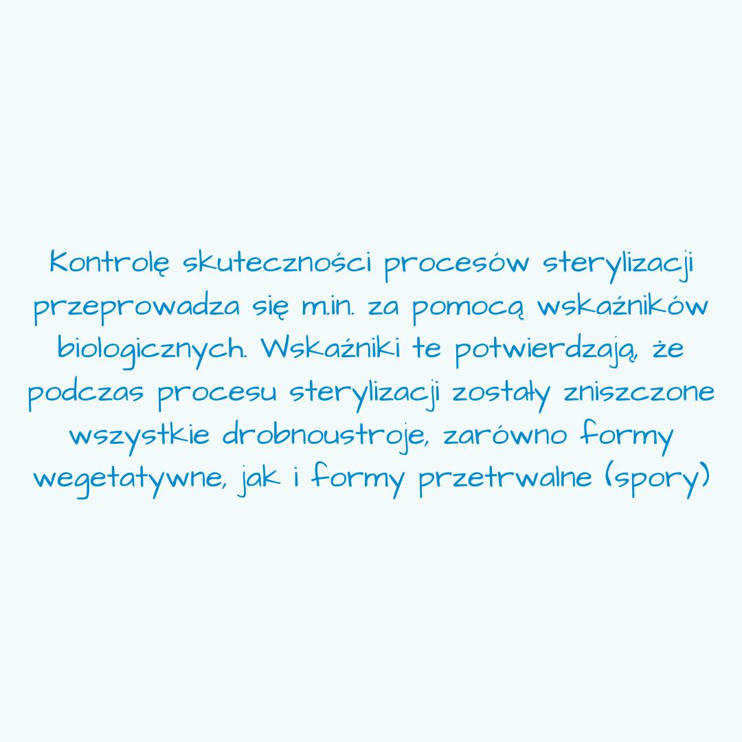Kontrolę skuteczności procesów sterylizacji przeprowadza się m.in. za pomocą wskaźników biologicznych. Wskaźniki te potwierdzają, że podczas procesu sterylizacji zostały zniszczone wszystkie drobnoustroje, zarówno formy wegetatywne, jak i formy przetrwalne (spory)