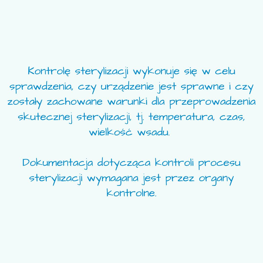 Kontrolę sterylizacji wykonuje się w celu sprawdzenia, czy urządzenie jest sprawne i czy zostały zachowane warunki dla przeprowadzenia skutecznej sterylizacji, tj. temperatura, czas, wielkość wsadu.