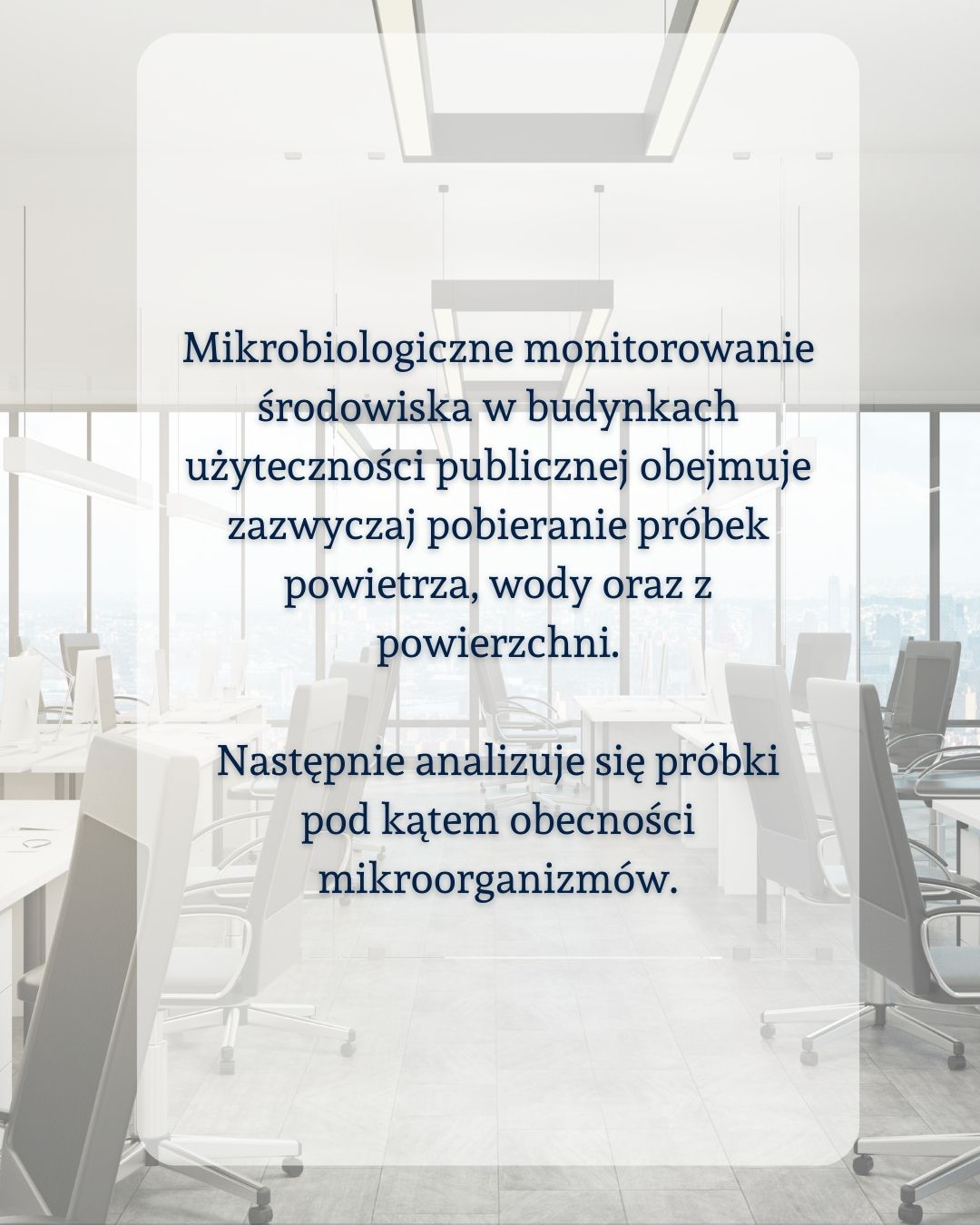 Mikrobiologiczne monitorowanie środowiska w budynkach użyteczności publicznej obejmuje zazwyczaj pobieranie próbek powietrza, wody oraz z powierzchni.
